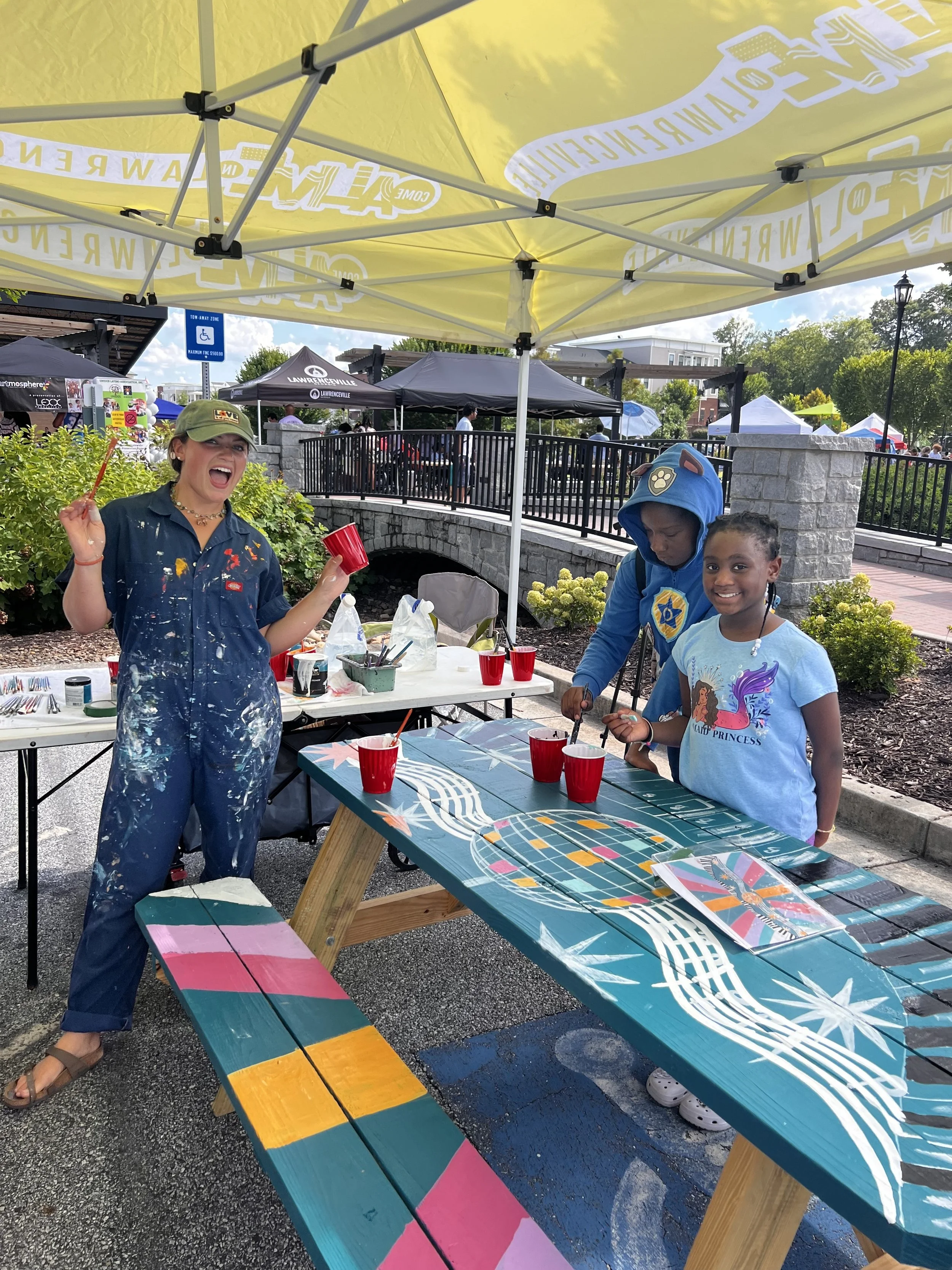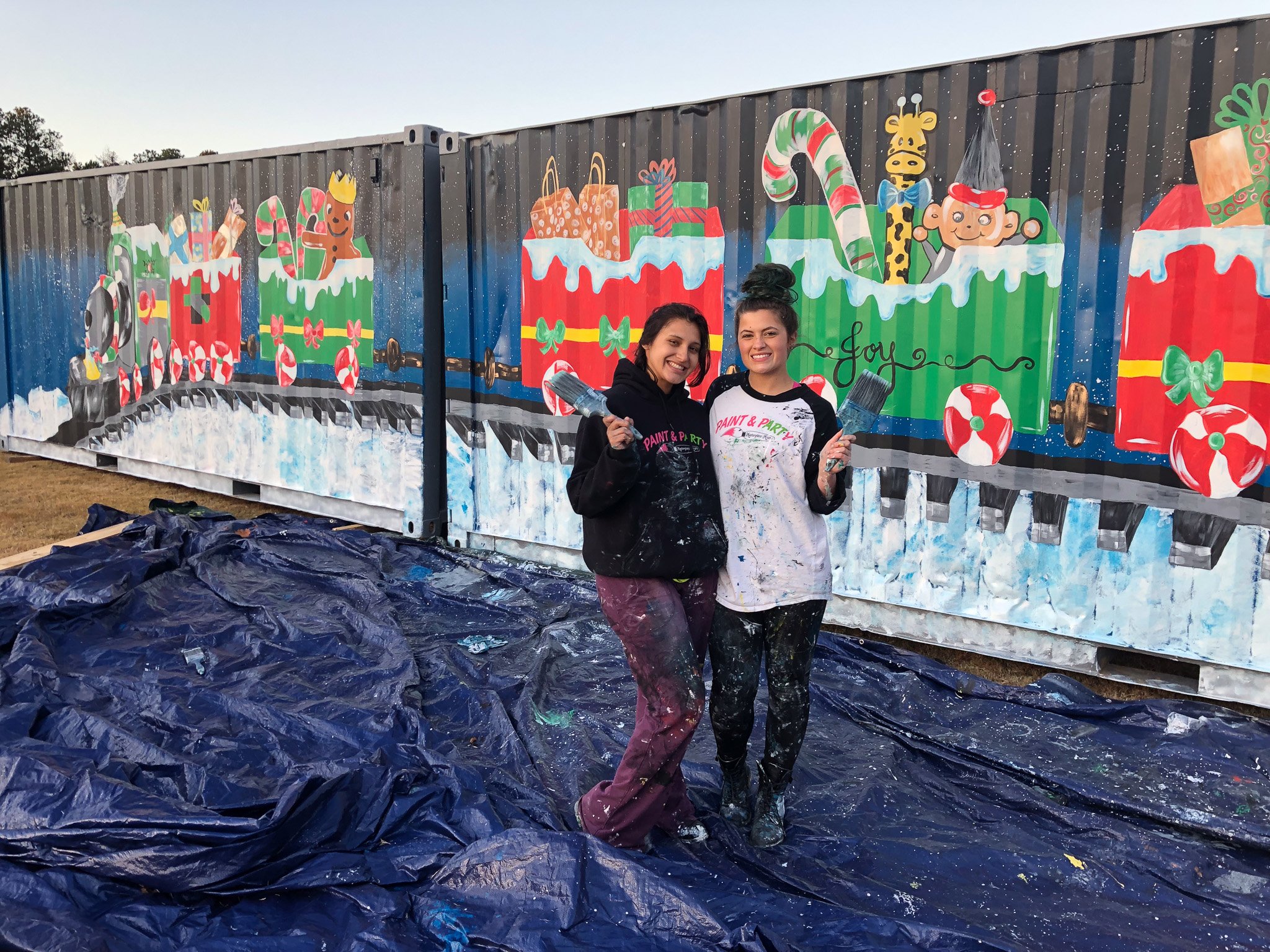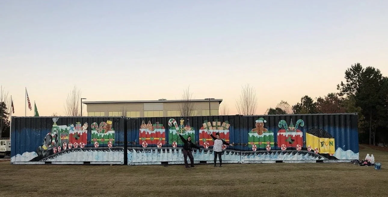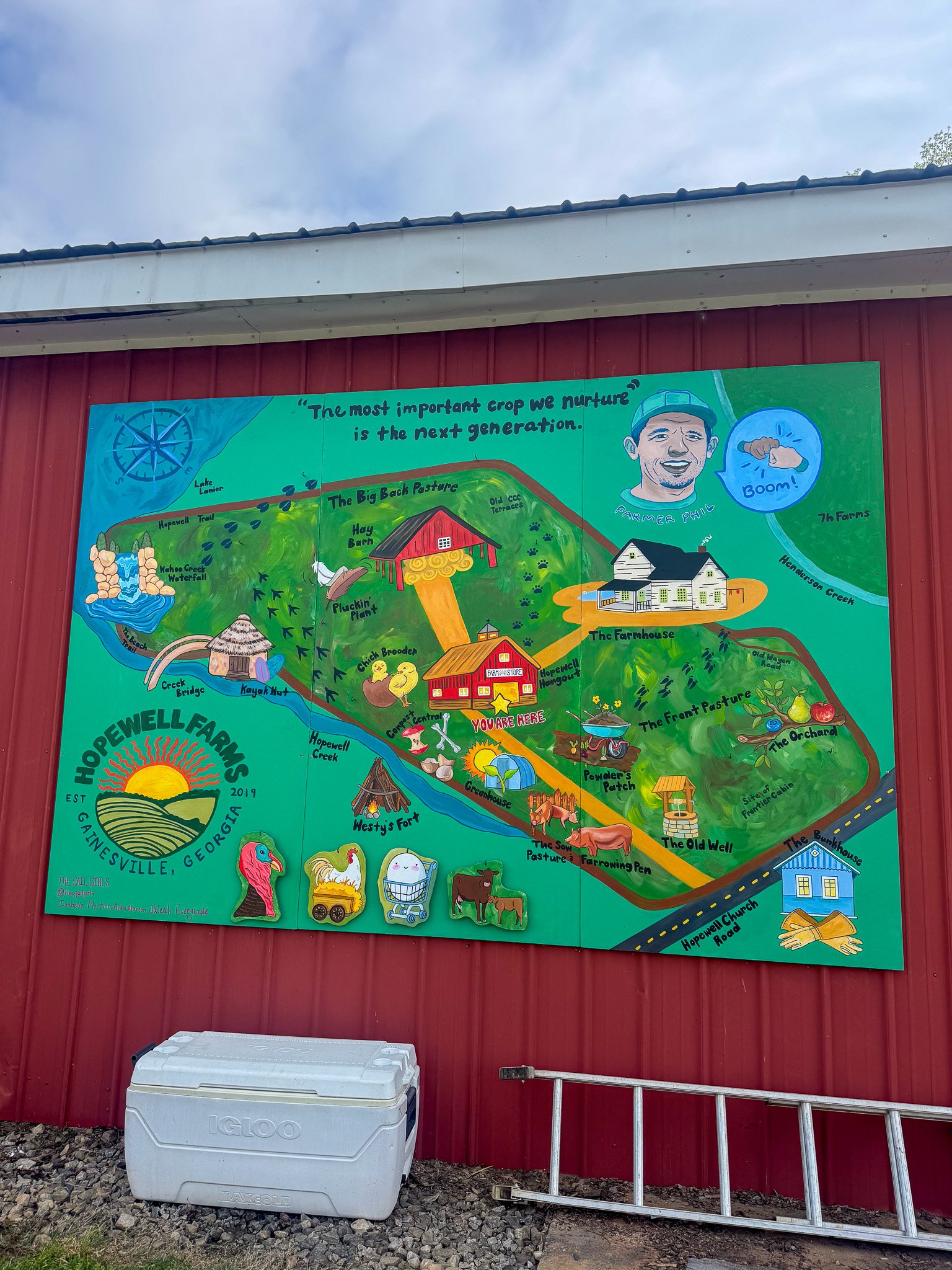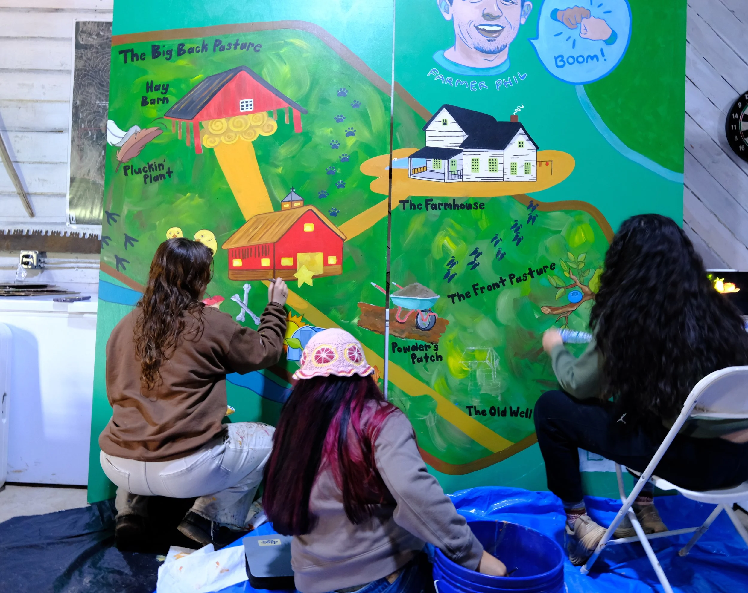 Designed and Painted by the Gail Girls Art Collective (Isabella Martino, Aida Alarcón, Juleah Everglade) and features interactive elements like painted, wood cut-outs that can be moved to different hooks when animals are rotated.